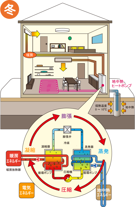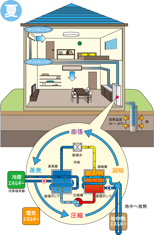 地中の温度は、年間を通して比較的安定した温度を保っています。この性質を利用すれば、ヒートポンプシステムにより、地下を暖房の際の熱源、冷房の際の放熱先として利用することで、クリーンなエネルギーを得ることができます。